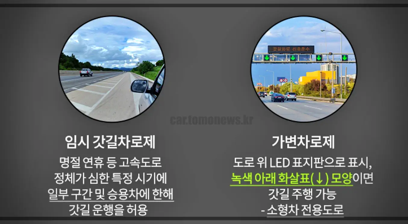 | 차선 폭이 좁음 | 갓길이나 가변차로를 활용하기 때문에, 일반 차선보다 차선 폭이 좁습니다. 따라서 차량 간의 간격을 충분히 유지하고, 급하게 차선 변경을 하지 않도록 합니다. |