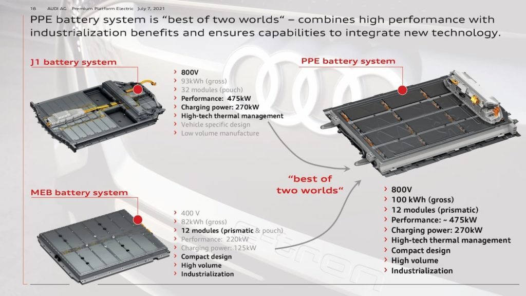 PPE 배터리 시스템 특유의 기술적 측면은 최대 100 kWh(gross)의 높은 에너지 함량을 달성할 수 있는 가능성입니다. 참고로, MEB와 J1 배터리 시스템은 각각 82 kWh(총량)와 93 kWh(총량)로 최대 출력됩니다.