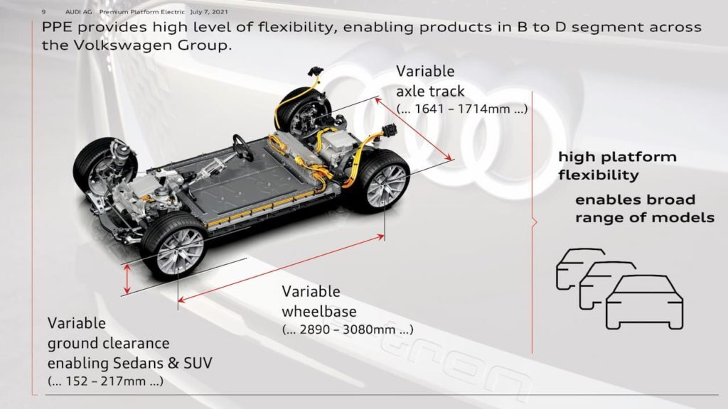아우디는 PPE가 MEB와 유사하지만 더 높은 출력으로 더 큰 성능 파라미터를 허용한다고 말합니다. 후면 장착 전기 모터가 표준이며, 고급 구성은 eAWD용 프론트 액슬에서 두 번째 전기 모터(PSM 또는 ASM)를 얻을 수 있습니다.