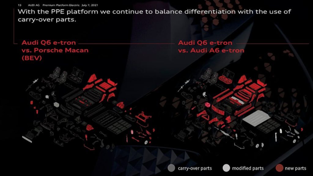 아우디 Q6 e트론은 앞으로 출시될 마칸 일렉트릭의 거의 모든 부품을 빌릴 예정이며, A6 e트론과도 상당 부분 비슷한 관계를 맺게 됩니다. 이미지 원본:아우디