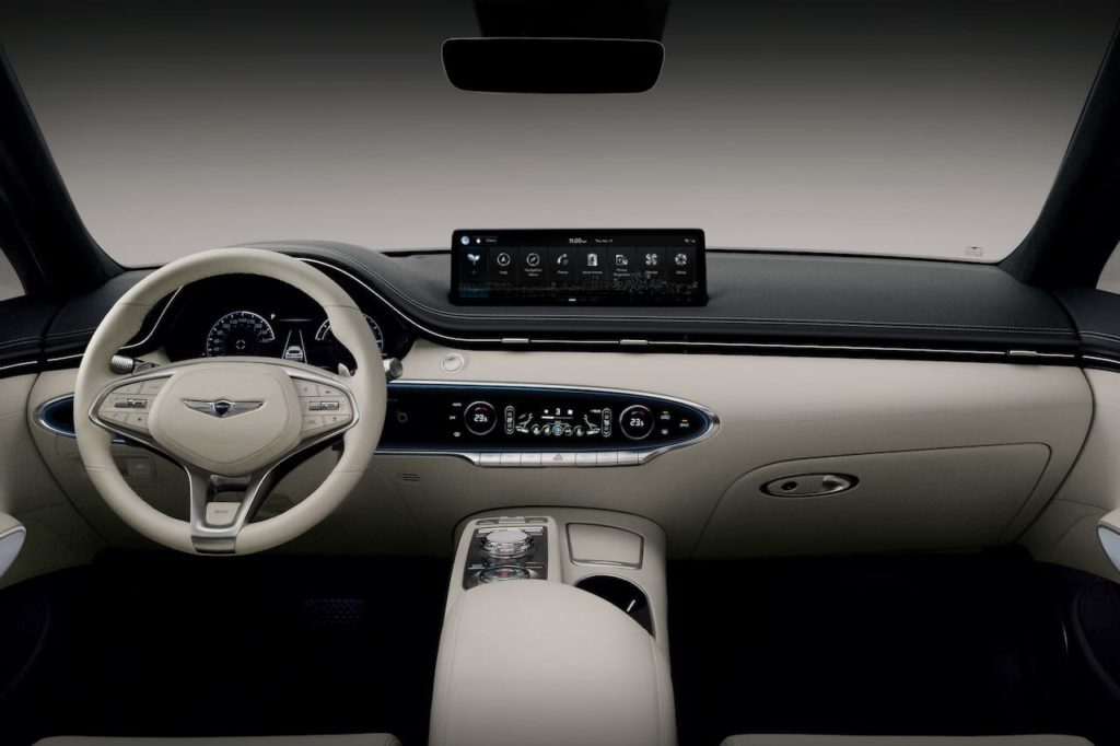 제네시스 일렉트리피드 GV70의 인테리어 디자인은 ICE 공여 모델과 다르지 않습니다. 전기 SUV는 눈에 띄는 3스포크 스티어링 휠과 듀얼 톤 대시보드가 특징입니다.