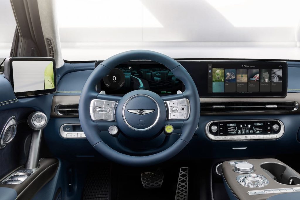 제네시스 GV60은 조종석 구역의 단일 패널에 두 개의 플로팅 스크린이 통합되어 있습니다. 이미지 원본:창세기