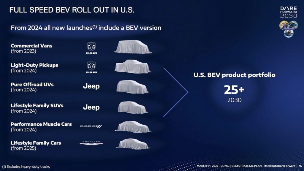 카를로스 타바레스(Carlos Tavares) CEO는 2022년 3월 1일 스텔란티스의 '데어 포워드 2030' 장기 전략 계획을 공개하며 미국 전기차 제품 로드맵을 공유했다. 슬라이드는 2025년까지 미국에서 2개의 Jeep EV 출시를 밝혔고 Lifestyle Family SUV는 Grand Wagoneer EV가 될 수 있습니다. 다음은 위의 프레젠테이션 슬라이드가 백그라운드에서 재생되는 동안 Tavares가 말한 내용입니다.