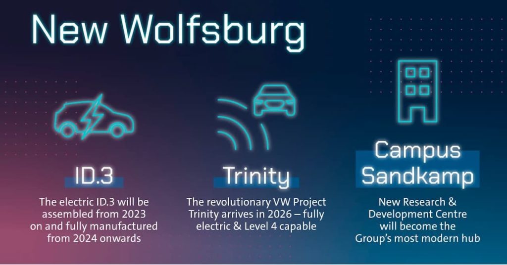 2022년 3월 4일, VW의 감독 위원회는 Trinity 공장이 공식적으로 승인되었음을 확인했습니다. 부지는 주요 공장과 가까운 Wolfsberg-Warmenau에 위치할 것입니다. Trinity 전기 모델에 20억 유로가 투자되고 탄소 중립 시설 건설이 2023년 봄에 시작될 예정입니다. VW는 또한 Trinity 전기 모델이 2026년에 생산 라인에서 나올 것이라고 확인했습니다. 또한 Trinity 시설은 전 세계에 있는 VW의 나머지 공장을 위한 모델입니다.