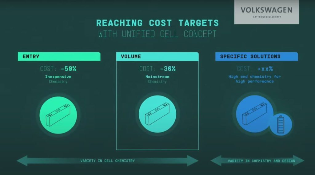 폭스바겐 그룹의 소형 EV는 아직 이름이 정해지지 않은 시트 크로스오버나 VW ID.2 X와 같은 통합 셀 기술의 혜택을 받을 가능성이 높입니다. 다른 화학 물질에 사용되는 동일한 물리적 팩 포맷으로, 통일된 세포 기술은 개발 및 생산 비용을 낮출 것입니다. 디에스 측은 2021년 3월 이 회사 파워데이 행사에서 "입력 부문에서는 통합 셀이 배터리 비용을 현재보다 50% 절감할 수 있을 것"이라고 말했습니다.