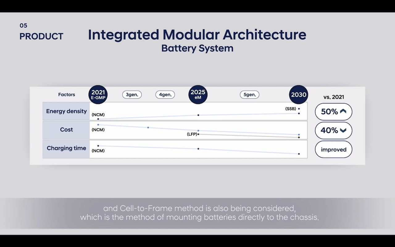 현대차는 eM 플랫폼 기반 EV에 사용하는 NCM 셀 정합성 배터리 비용이 E-GMP 플랫폼 기반 EV의 NCM 셀 정합성 배터리에 비해 40% 낮을 것으로 보고 있습니다. 고체 배터리 기술을 상용화할 계획인 2030년까지 이 같은 대폭적인 비용 절감을 목표로 하고 있습니다. 위에서 설명한 것처럼 E-GMP 플랫폼 기반 EV와 달리, eM 플랫폼 기반 EV는 LFP 셀로 구성된 배터리 팩과 함께 사용할 수 있게 됩니다. 아이오닉 3은 주요 수신자여야 합니다.