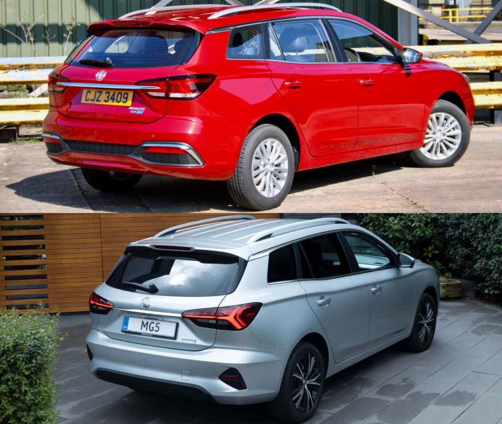 2022년형 MG5 일렉트릭(아래)은 후면이 날렵하고 새로운 LED 틸램 시그니처와 크롬이 적습니다. 이미지: MG 모터
